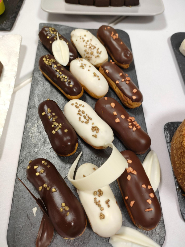 Начинку нагреть до 35С , нанести на эклеры, посыпать декором