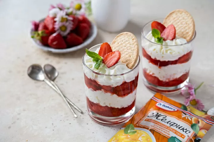 Выкладываем в стакан поочерёдно клубничное варенье и крем. Украшаем печеньем и подаём к столу.