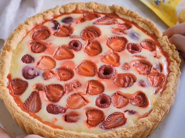 Добавляем яйца (2 шт.), сахар (50 г) и щепотку соли и быстро замешиваем тесто. Формируем из теста шар, оборачиваем его плёнкой и отправляем в холодильник на 30 минут.Для начинки яйца (2 шт.) взбиваем с сахарной пудрой (60 г) и ванильным сахаром (8 г) до однородности. Добавляем сметану (400 г) и перемешиваем. Всыпаем крахмал (30 г), смешиваем до однородного состояния.
