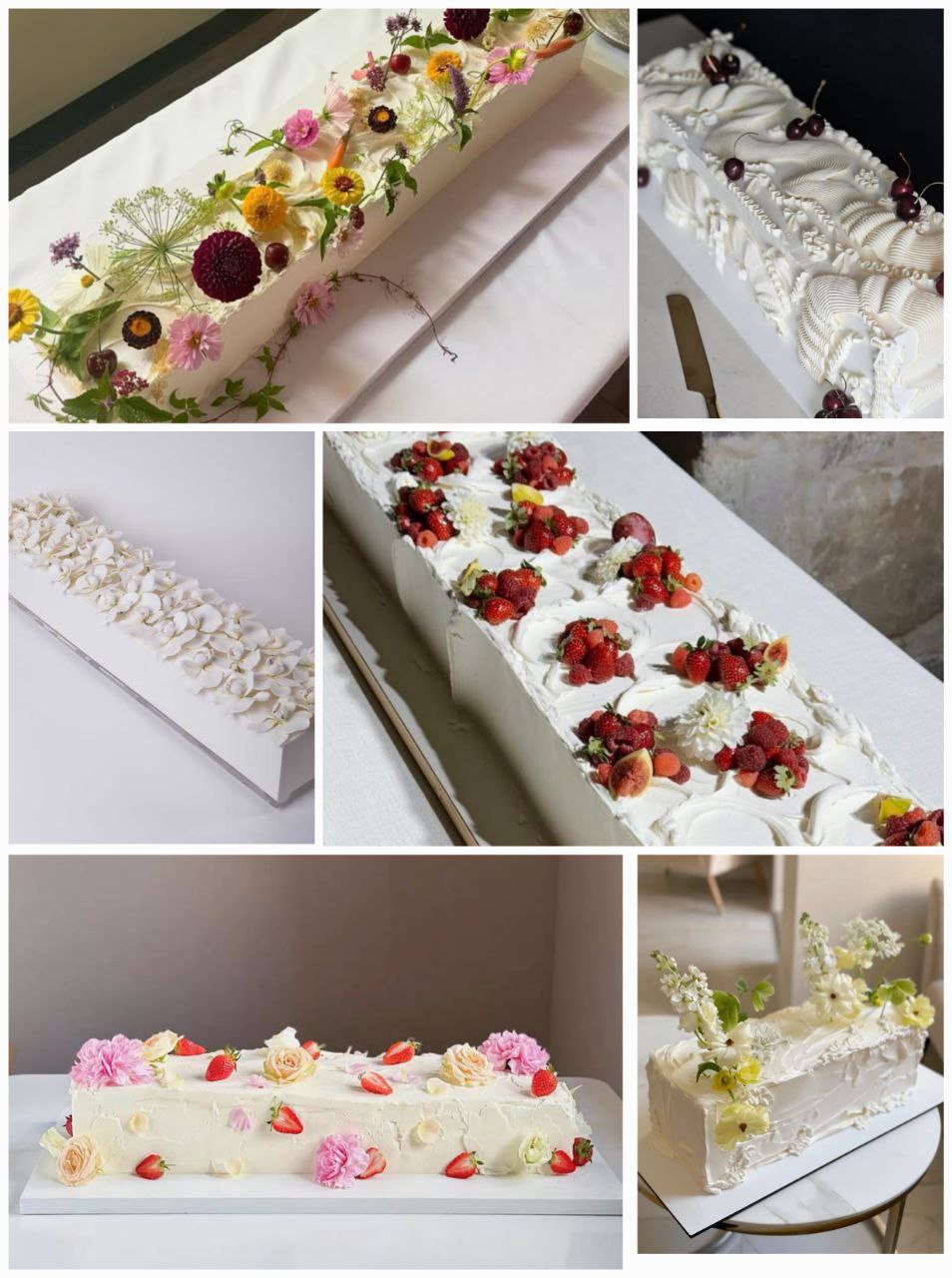 Торт, похожий на дорожку. Или на клумбу, потому что его минималистично украшают цветами или свежими ягодами. Смотрится элегантно и очень удобно резать на кусочки.