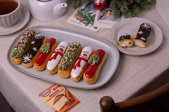Приготовьте глазурь по инструкции на упаковке. Покройте эклеры глазурью и украсьте посыпками или кокосовой стружкой.