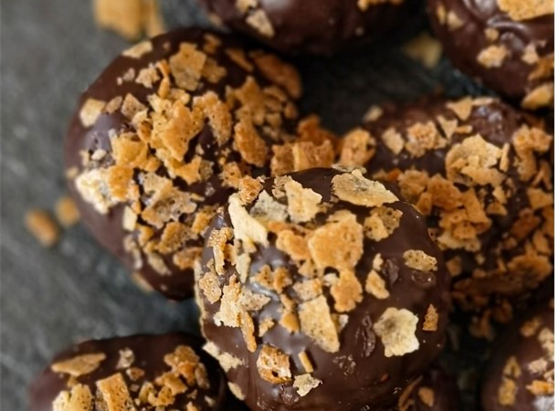 Технология приготовления: Соединить сливки с глюкозным сиропом, довести до кипения. Добавить шоколад, сливочное масло и коньяк.Пробить блендором. Поставить в холодильник для стабилизации на 1 час. Охлажденную массу скатать в конфетки по 15 гр и покрыть темперированным шоколадом, обвалять в какао или вафельной крошке.