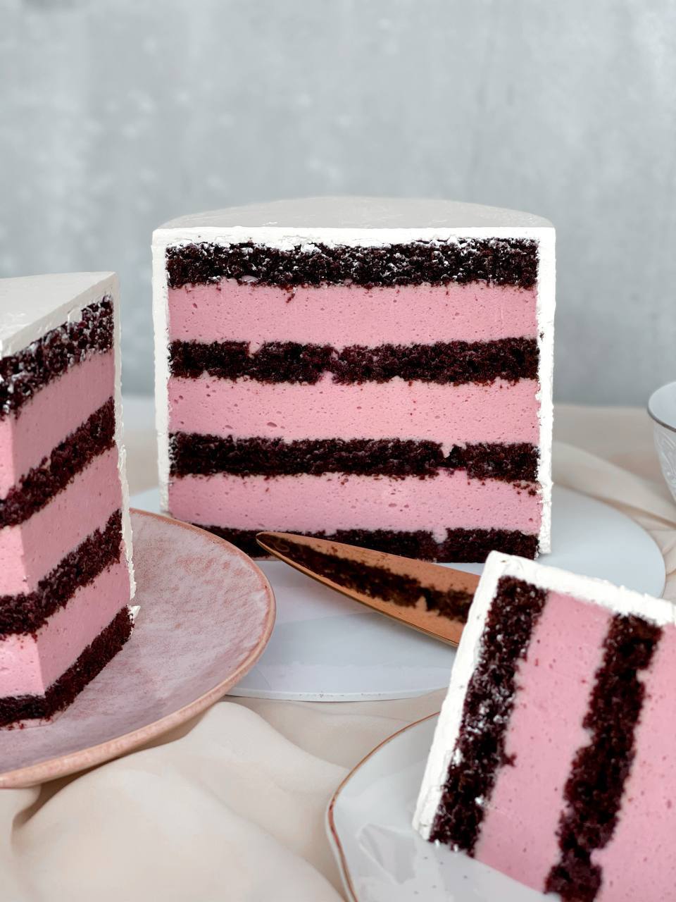 Собирать торт, выливая на бисквит 1 часть мусса. Желательно ставить торт в морозилку на 5-10 минут после каждого внесения мусса , чтобы разрез был ровным, красивым и ничего не утекло.