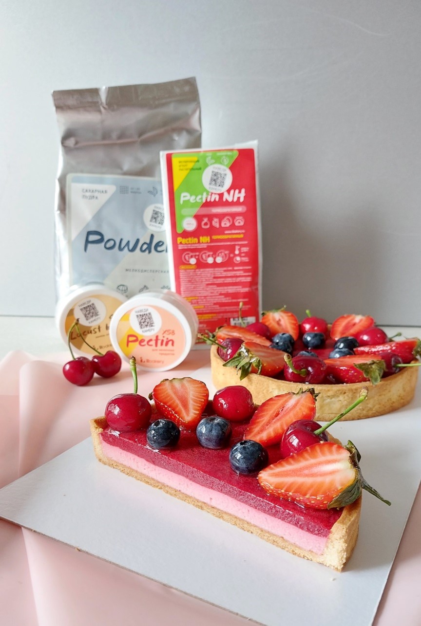 тарт с начинкой, с применением пектинов х 58 и nh от ILbakery и нейтральной глазурью из смеси Neutral glaze от ILbakery, или растительным желатином Vegetable gelatin от ILbakery.