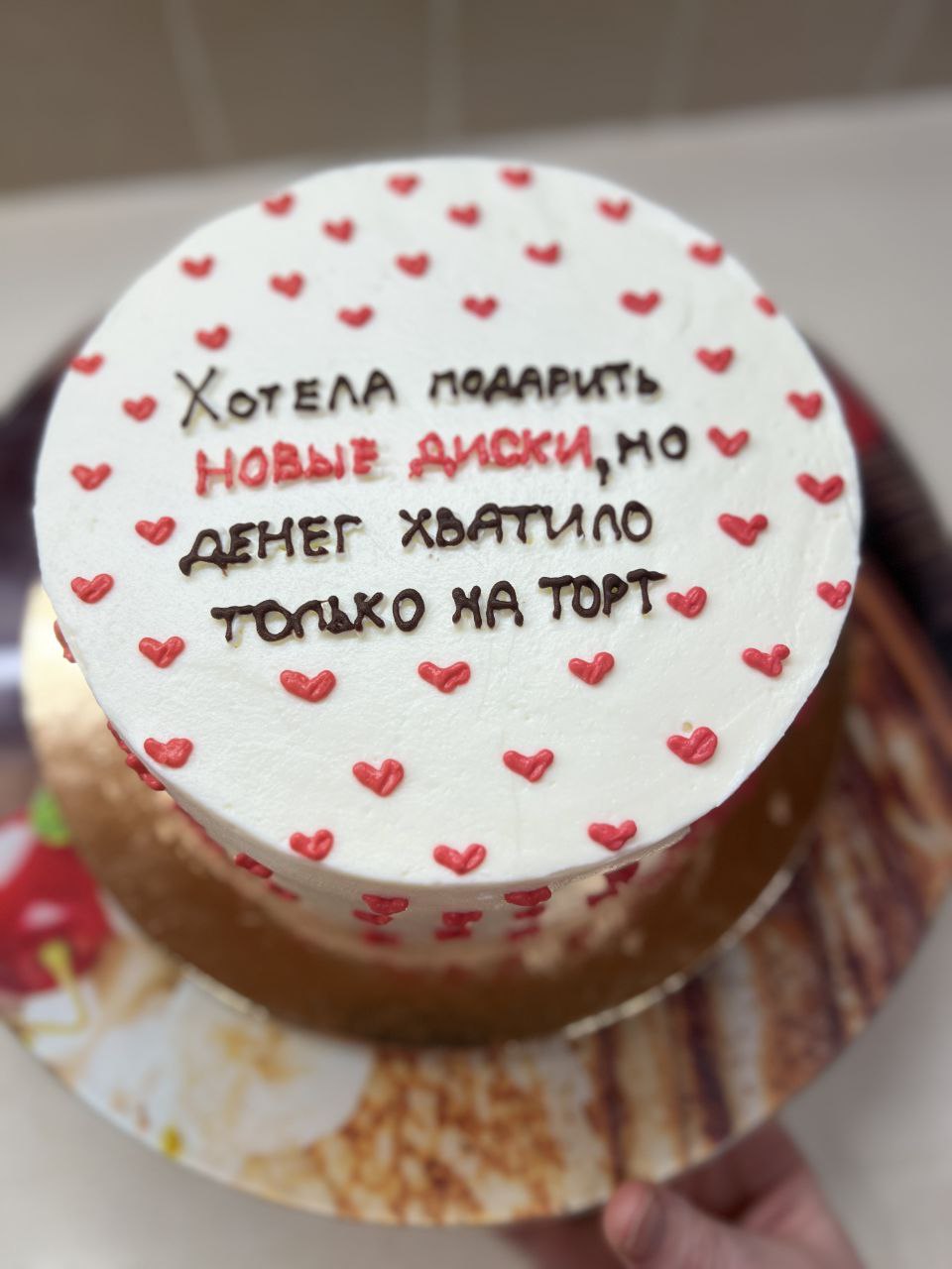 Сборка: кладем шоколадный бисквит, пропитываем сиропом из карамели. Кладем кремчиз с бортиком, в центр выкладываем карамель и присыпаем арахисом. Накрываем вторым коржом, пропитываем карамельным сиропом. Кладем арахисовый крем чиз и накрываем третьим коржом. Сверху наносим тонкий слой карамели. Оставляем торт в кольце на ночь. Выравниваем торт кремчизом. Оформляем надписью из крема и молочного шоколада, и сердечками из окрашенного крема.
