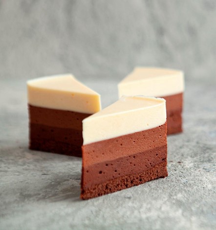 2. Устанавливаем шоколадный̆ корж и заливаем мусс на чёрном шоколаде, после — на молочном и последний — белый.