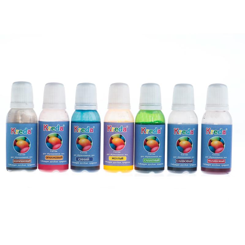 Состав набора: 7 красителей (малиновый, оранжевый, жёлтый, салатный, синий, сливовый, коричневый), декоративная соломка, инструкция по применению, пасхальный рецепт.