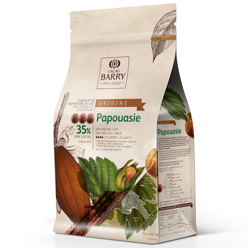 Papouasie. 35% какао, 23,5% молоко, 36,9 % жиры. Разновидность Forastero. Душистый фундук, насыщенный сливочный вкус и оттенок карамели